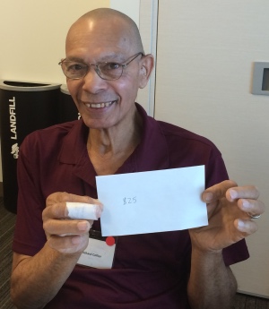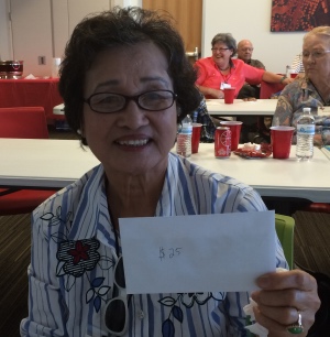 All the pre planning and preparation was spearheaded by Estella & Ralph Garcia, as they have done several times in the past. What a wonderful job they do to organize everything so that things go smoothly each time. The food is always very good and what a bargain for a mere $3.00 per person - great sandwich, bag of chips, cookies, sodas - all to prepare us for a great afternoon of White Elephant Bingo to follow. Estella & Ralph were helped in the setup at TI by a group of volunteers that helped get all the food ready for easy pickup by attendees as they begin to arrive around noon. Jean Houston and Della DuHart were there at the entrance to the break area, to greet all the guests after they had signed in with TI Security. They provided everyone with a lucky White Elephant Bingo card.