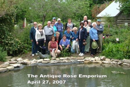 Unfortunately, at the Antique Rose Emporium, the peak rose (and other Texas wildflowers) display season was about 2-3 weeks ago. We took a group picture in front of an onsite pond.