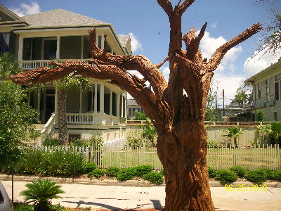 Our bus driver was very knowledgeable and after the tour he guided us through the streets to show us the sculptures made from the tree stumps left by Hurricane Ike. James D. Phillips, who sculpts wood by trade, went to work on a dead tree stump at city hall’s southeast lawn, but it wasn’t being removed like so many other damaged trees on the island. It was transformed into public art. The tree died, along with a majority of Galveston’s beloved and expansive live oaks destroyed by Hurricane Ike’s storm surge. Phillips, displaying oddly graceful maneuvers with his chainsaw, skimmed away the stump until the vague shape of a Dalmatian was deciphered. He will sculpt a larger tree just yards away into a water hydrant, paying homage to the fire department next door. The sculptures are part of a project spear-headed by the city’s Tree Committee, which the city council created last month. After Hurricane Katrina in 2005, residents in affected communities began carving their trees instead of demolishing them, which inspired the committee. We managed to see a few of them and took pictures.