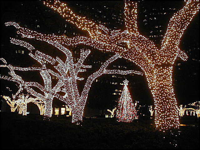 movie, displaying wrapped trees with internal strings of dangling white-red-blue-green lights and framed,