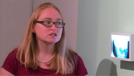 We were greeted by Leah French, the volunteer manager and education coordinator, who served as our tour guide. She explained briefly the mission of the craft museum, the works on display, the resident artists program. She began our tour by visiting the Main Gallery and on into the Charlotte Potter: Glass Armory in the front gallery. We saw some of the most unique creations, hard to describe, but Leah answered our questions with obvious passion for the artist and his/her work. For example, some fabrics showed realistic body imaging (brain or internals, "views within"), side by side with the artist's abstract interpretation. As expected, pieces in wood, ceramic/clay, metal/wire, cloth/fabric and glass/stone were on shelves or hung in numerous display cases. Resident artist, Susan Budge, stepped out to explain her personal history (as a teacher), her love of craft (ceramics), and gladly showed us around her working area.