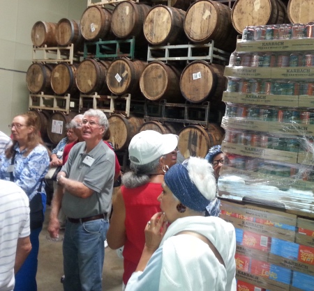 After the brewery tour ended around 2:30, our tour guide took us to the merchandizing booth located next to the huge, covered, bench-filled Biergarten. She handed out to each of us an inscribed 'Karbach Brewery' pint-sized souvenir glass holding three tokens exchangeable at the nearby multi-tap, draft station. Available were a wide selection of current production draft beers: Octoberfest, Weisse versa, various ales, blondes and IPAs. Even our bus driver, Demari Cook, got his own Karbach glass (and extra tokens from some of us), but he refused, wisely, to sample anything.