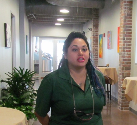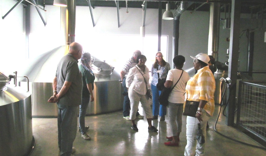 Being time for lunch, we rode over to the Karbach Brewery located - surprise! - on Karbach Street. Seated at five reserved tables in groups of 4 or 6, we received fairly quick service. All six lunch menu selections looked and tasted delicious, and the portions were about right. As we finished and paid, Patti, Karbach's internal tour/event coordinator came around, greeted many, and then introduced today's tour guide, Sue Hey. Sue corralled and guided us upstairs to the 4-5 "warm" brew house tanks. The brew house is where high-quality water, hops, barley (or another grain) and yeast are all mixed, boiled, cooled and filtered. The quality control lab was visible in a side room, where QA personnel keep tab on the interim product (called wort) at various steps.