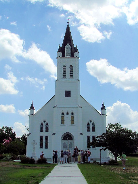 Our first church, Sts. Cyril and Methodius Church in Dubina (a variation of the Czech word for oak), was first built in 1876 and destroyed in 1909 by a hurricane. Rebuilt in 1912, it survived a fire that destroyed the town. This elegant white wooden church has the wrought-iron cross topping the steeple that was made by a former slave. It was rescued from the 1876 church that was destroyed by the hurricane. Inside the work is timeless with arches outlined in ivies, flowers, and trailing oak leaves.