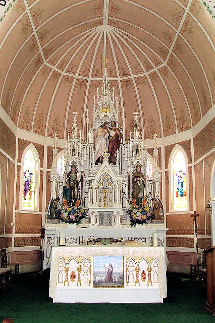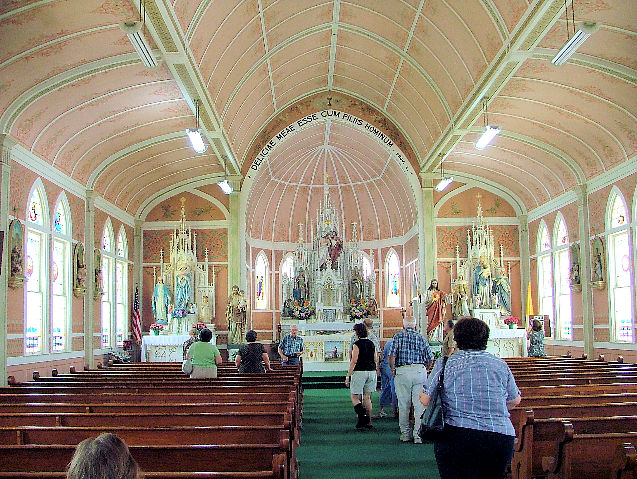 In a move that now seems almost reprehensible, the congregation painted over the artwork in 1953 for the settlement's Diamond Jubilee celebration. In 1981, a former altar boy convinced the parishioners to uncover and restore the art. Using alcohol, cotton swabs, some of the original stencils, and a little creativity, the beautiful paints came back to life around a sky of blue ceiling.