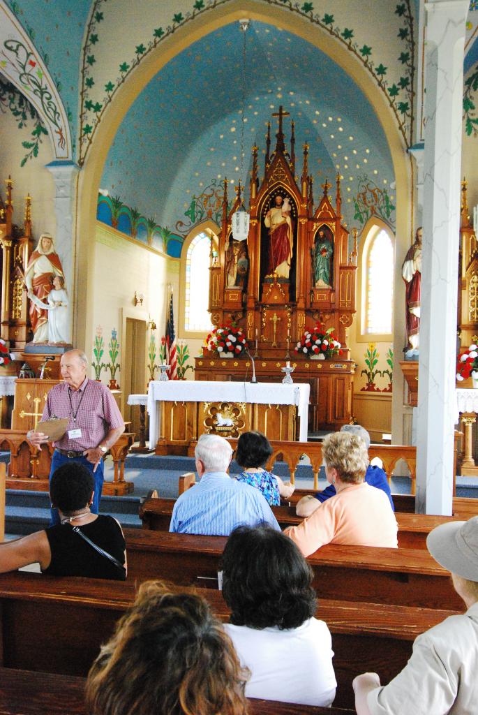 Remarkably, no part of the painting has ever needed to be retouched. We stopped for lunch at the Oakridge Smoke House. As many times as I have been down I-10 I had never stopped there. It came highly recommended by the Schulenburg Chamber and now I can understand why. The food was good and the place was unique. It is not only a restaurant. It serves as a bakery, confectionary shop as well as gift store. Many took advantage of this stop and bought things that reminded them of their childhood. About three miles northwest of Schulenburg we arrived at St Mary's Catholic Church in High Hill. The 111 foot steeple on the brick and stone building is a stately example of Gothic revival architecture reminiscent of European cathedrals. The bright colors of stain glass windows, the soft colors of the arches and paintings of angels draw the eyes of the congregation toward heaven. The elaborate faux marble columns and ceiling and the magnificent hand carved wood and glass altar is a sight to see.