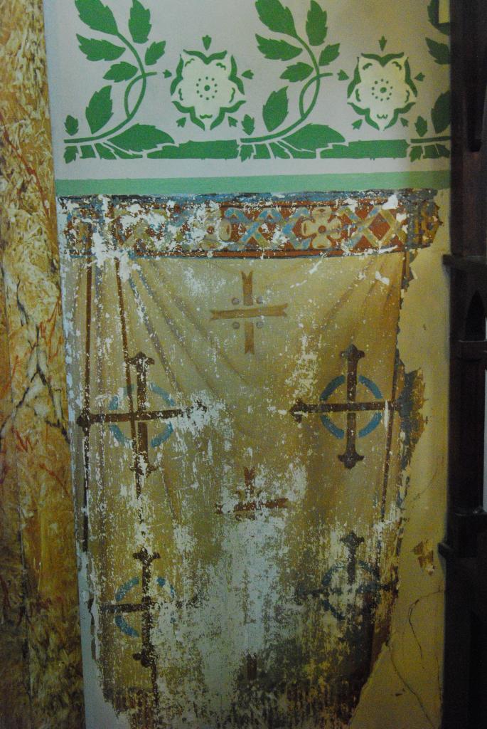 It was rescued from the 1876 church that was destroyed by the hurricane. Inside the work is timeless with arches outlined in ivies, flowers, and trailing oak leaves. In a move that now seems almost reprehensible, the congregation painted over the artwork in 1953 for the settlement's Diamond Jubilee celebration. In 1981, a former altar boy convinced the parishioners to uncover and restore the art. Using alcohol, cotton swabs, some of the original stencils, and a little creativity, the beautiful paints came back to life around a sky of blue ceiling that they added stars to.
