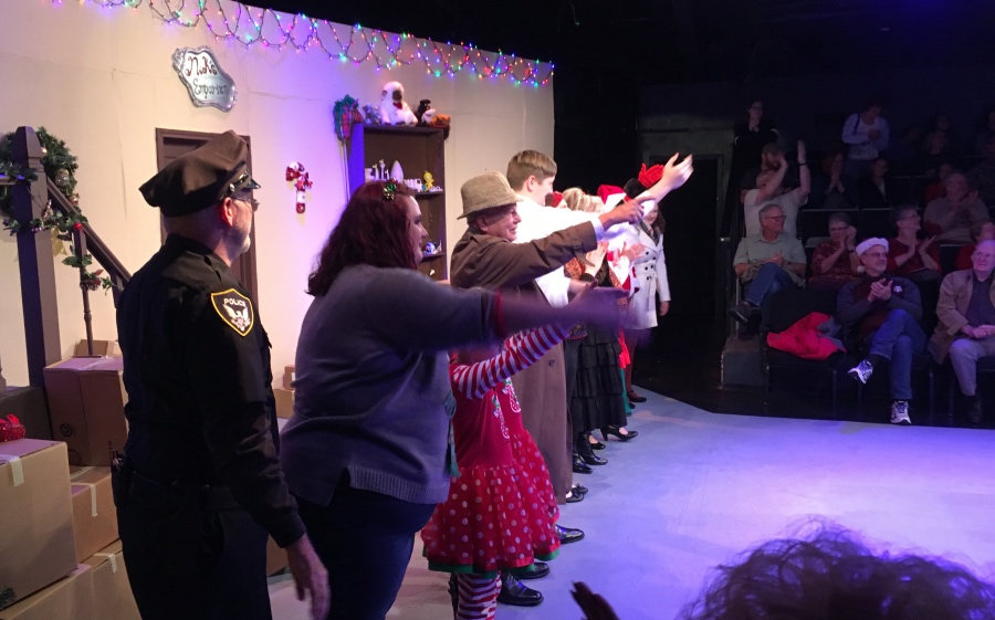 This group left Bayland Park with the exception of Drew & Linda, that met up with us at Pepper's Steak and Seafood Restaurant. Upon arrival we were seated at a long table. I saved two seats together at the end of the table for Drew & Linda because they were running late. I was at the opposite end of the table. Everyone was ordering when I looked were Drew and Linda were to sit and I saw an older gentleman seated next to the bus driver. I did not recognize him. So I went to ask if he was at the right table and realizing upon approaching him that he had had a stroke. I did not wish to embarrass him so I asked the waiter to see if she could find out what table he belonged at. You see that night there were several large groups at the restaurant. Sure enough Bob (that was his name according to the bus driver) had sat down with the wrong group, but thanks to our bus driver who helped him with the menu he was able to have his meal delivered to the right table. Senior's helping seniors. I guess we looked like a fun group and he decide to join us. This night we had dessert first. While we were waiting for our food to be brought to the table we sang "Happy Birthday" to Della. I know we were a month early; however, Pepper's will allow you to bring in a cake to celebrate so we all had dessert. If I do say so the chocolate cake was quite good. I also enjoyed my chicken fried steak - It covered the plater. It is a meal you could split or take home the leftovers like I did. Pepper's made sure we were out in time to make the play on time. The theatre was only a few miles away. Upon arrival at the Pasadena Little Theatre I handed out the tickets for the seating. Maybe I should have underscored Little in the name; however, this was their 62nd year of productions. Before the play started I took a few pictures of the group and there was one man in the audience that keep trying to get in the pictures. Again we are a fun bunch and he just wanted to join us. The theatre grew dark and when the light came up we were in Nick's Emporium with an elderly man, J. D. Morse, inquiring of the proprietor, Nick, if he had a particular watch for his grandson. Nick had all kinds of watches; however, not the kind J. D. needed. You would recognize the spirit of Santa Claus in Nick. Occasionally the lights would flicker and you knew you were to be transported back in time when J. D. had visited the emporium as a youth and missed his chance of true love. All turns out well when J.D. and the true love meet again in the magical empty emporium.