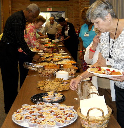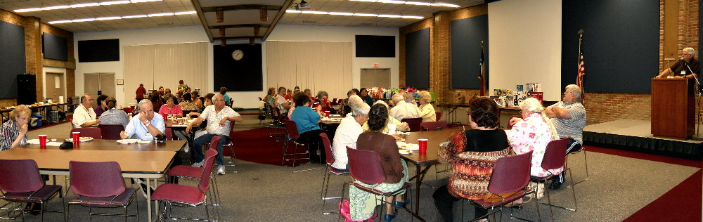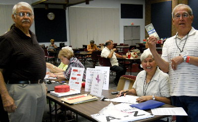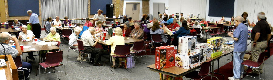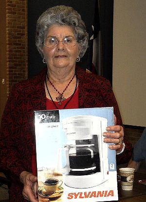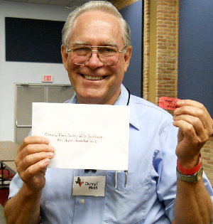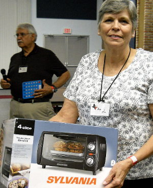 For only $3 per member, spouse or invited guest, there was much to appreciate. Tables of assorted fruits, vegetables, chips, cheeses, cookies and crackers plus coffee, flavored creamers, tea and water were available all evening while retirees played Bingo. The Event started at 6:30 pm as members and guests signed in and paid their $3. They also had the option to join in and play SUPER BINGO for a $5 donation per card and for a chance to win one or more of the super bingo prizes. After helping themselves to drinks and snacks, the attendees picked their table seats and enjoyed the comradeship of their friends. Behind them on several tables were the White Elephant Gifts that members themselves brought to used as prizes. A bingo card was given to each attendee and the bingo for the white elephant gifts was on. Lynn and Donald Stefan joined us from their home in The Woodlands saying that there was no way they would miss this yearly event. Good thing they attended. Don, again, was the Bingo Caller as he has been for several years.